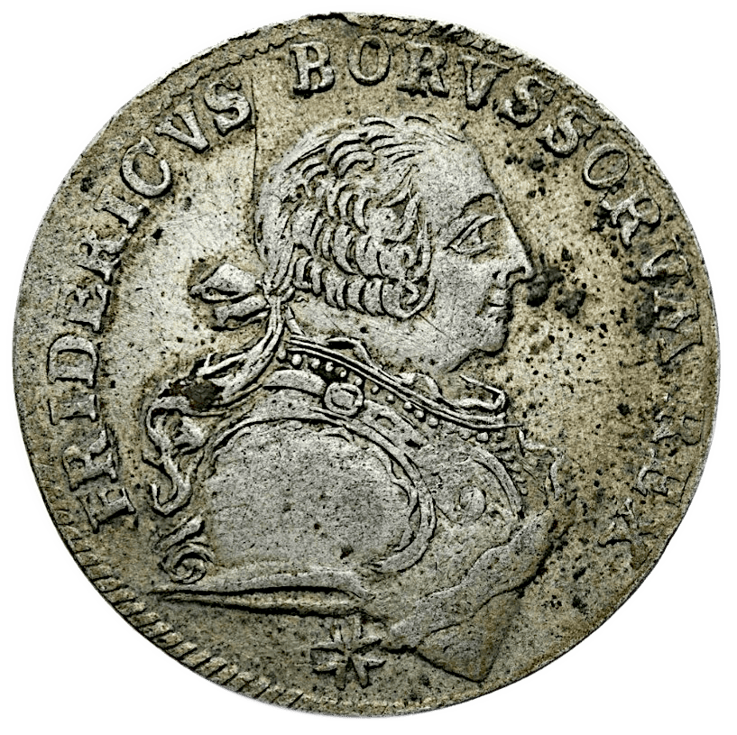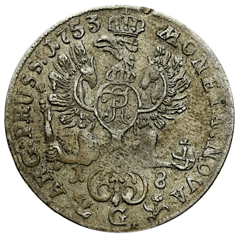 Dieser seltene 18 Gröscher aus dem Jahr 1753 wurde unter der Regentschaft Friedrichs II. in der Münzstätte Stettin geprägt – einer Münzstätte, die nur kurze Zeit in Betrieb war und daher vergleichsweise wenige Prägungen hervorbrachte. Entsprechend sind Stücke von dort heute begehrte Sammlerobjekte.