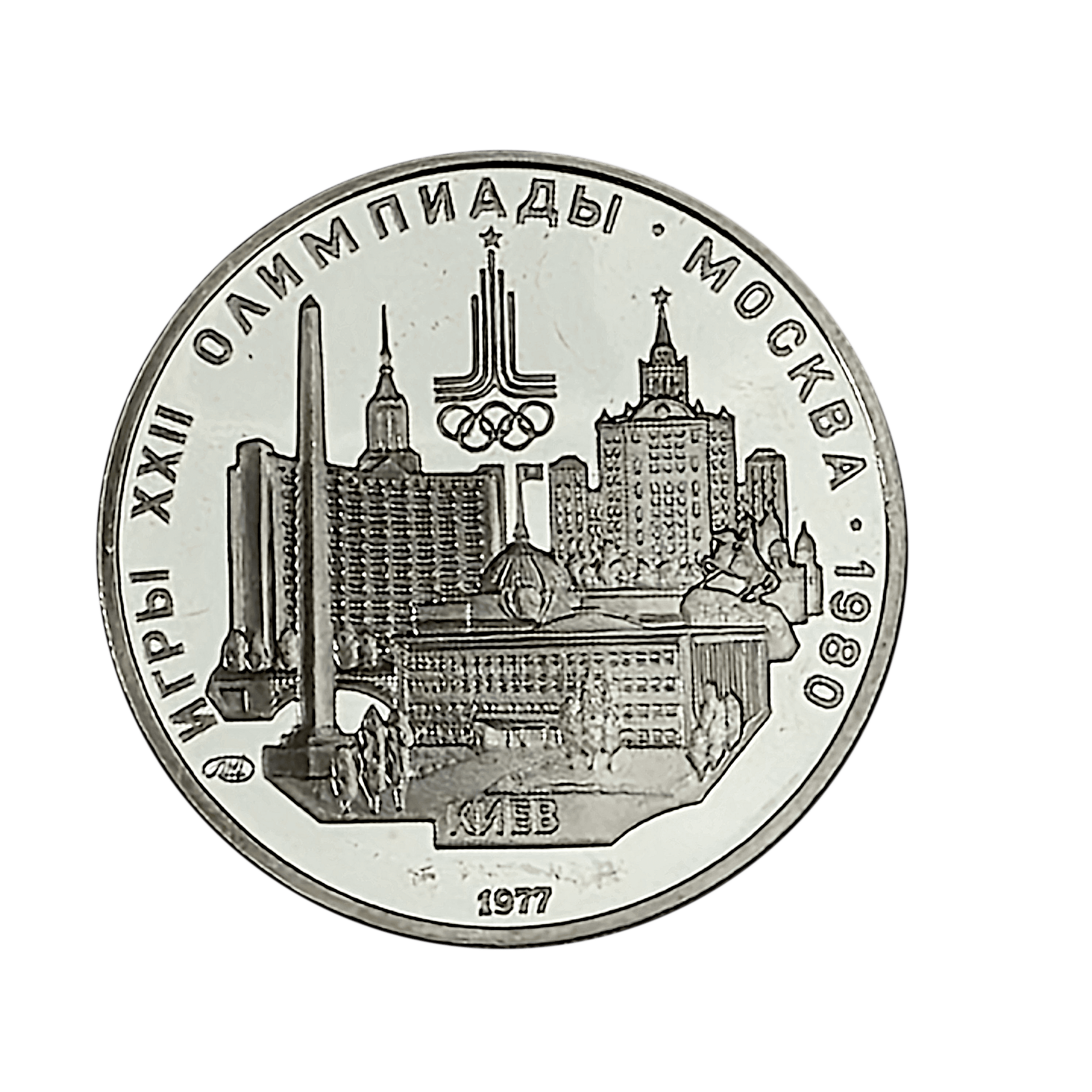 Dieses 5 Rubel 1977-Silberstück gehört zur ersten Ausgabereihe der Olympiade Moskau 1980 und ist der Stadt Kiew gewidmet – ein attraktives Sammlerstück für Olympia-, Sowjet- und Silbermünzenfreunde. Auf der Motivseite zeigt die Münze eine Stadtansicht von Kiew mit markanten Bauwerken; darüber schwebt das offizielle Emblem der Olympischen Spiele 1980. Die Wertseite trägt das Staatswappen der UdSSR mit Hammer und Sichel sowie die Nennwertangabe „5 Rubel“.